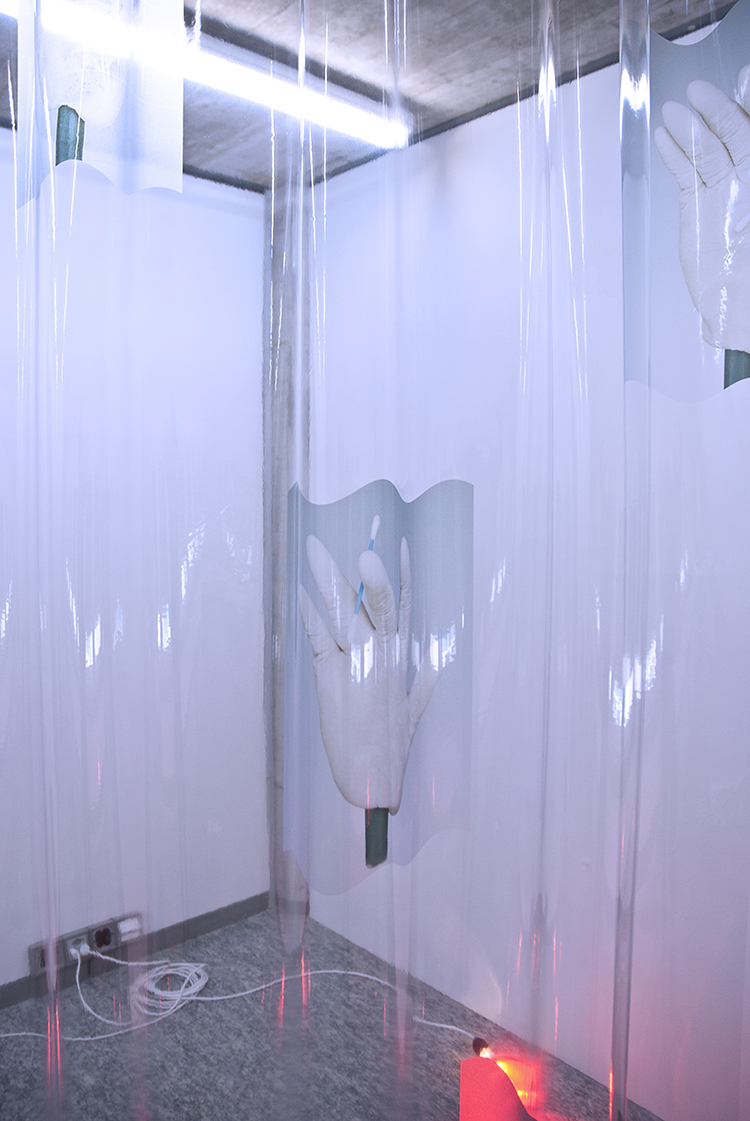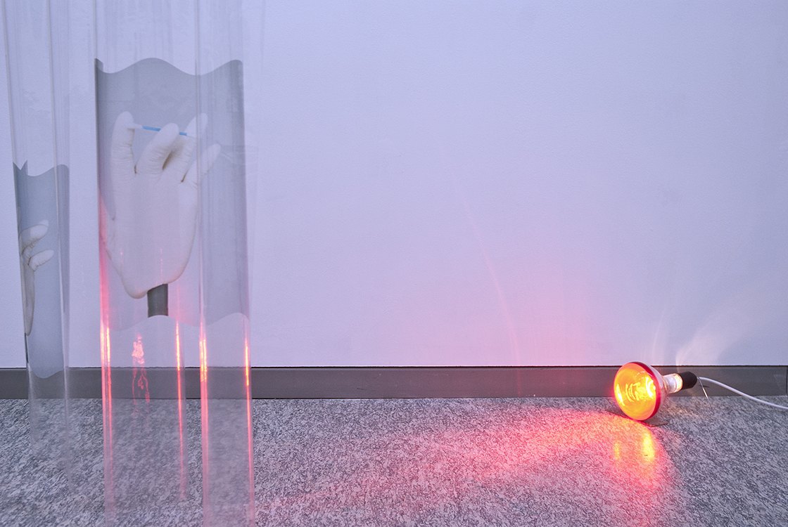 Skinsmooth edition of two (left and right hand) inkjet print on transparent pvc, infrared heating lamps 130 x 208 cm 2012